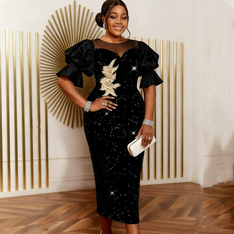AOMEIDRESS Elegant Sequins Midi Package Hip Peplum Wedding Guest Dress