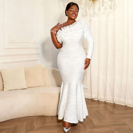 AOMEIDRESS One Shoulder Dress Pleated Long Flare Sleeve Package Hip
