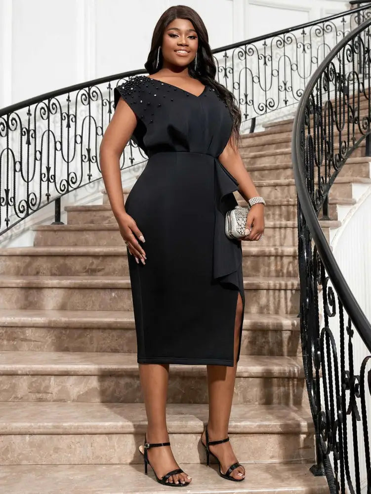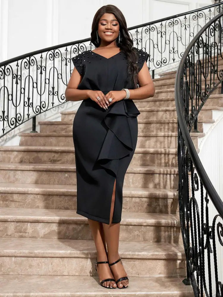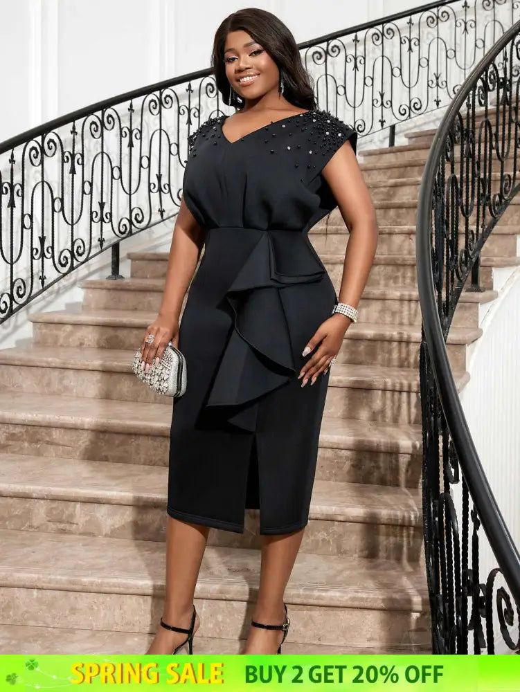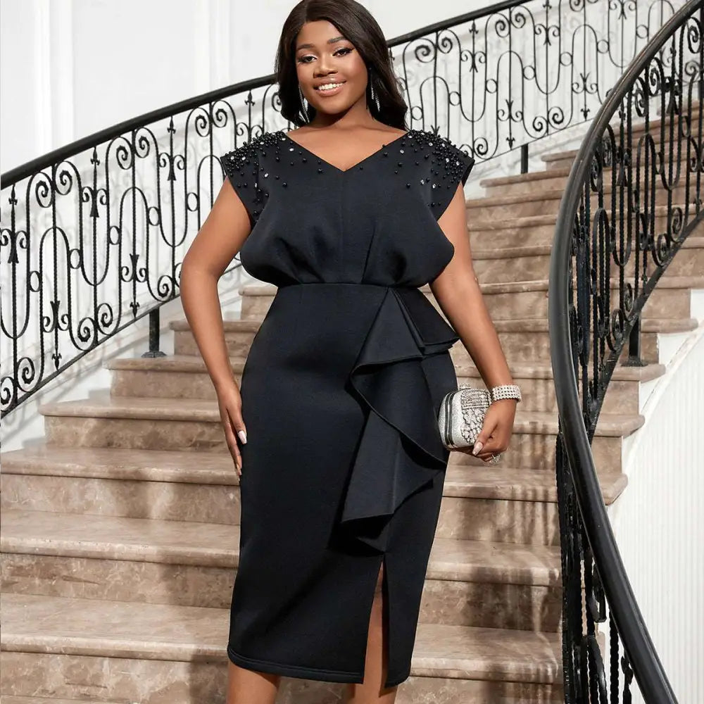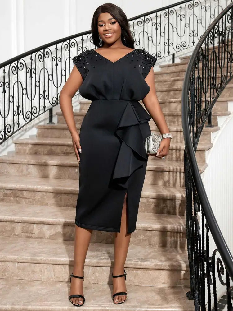 AOMEI Black V Neck Dress Women Sleeveless Beading Diamonds High Waist Ruffles
