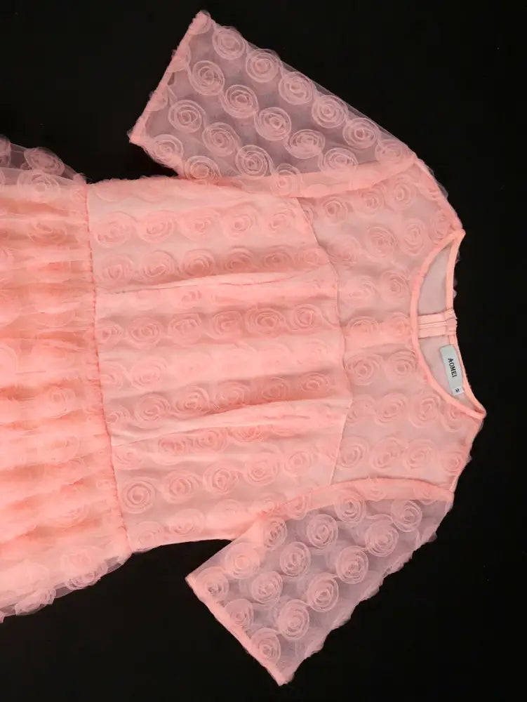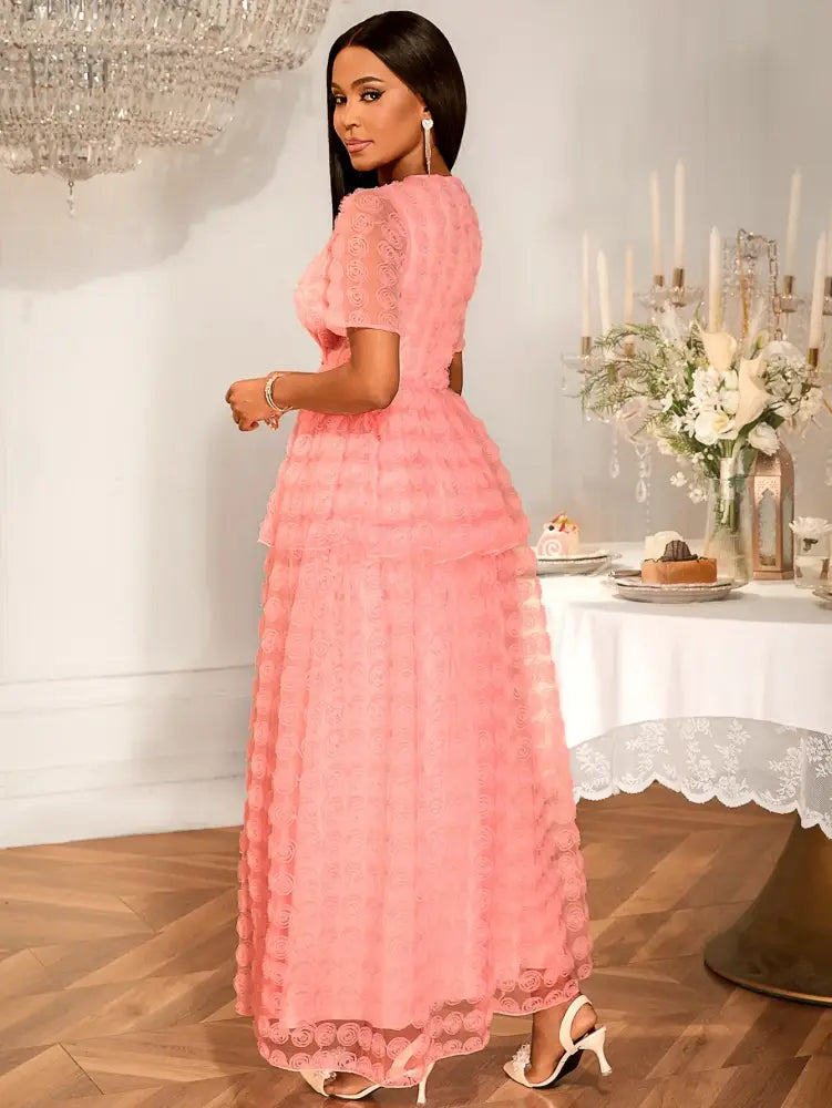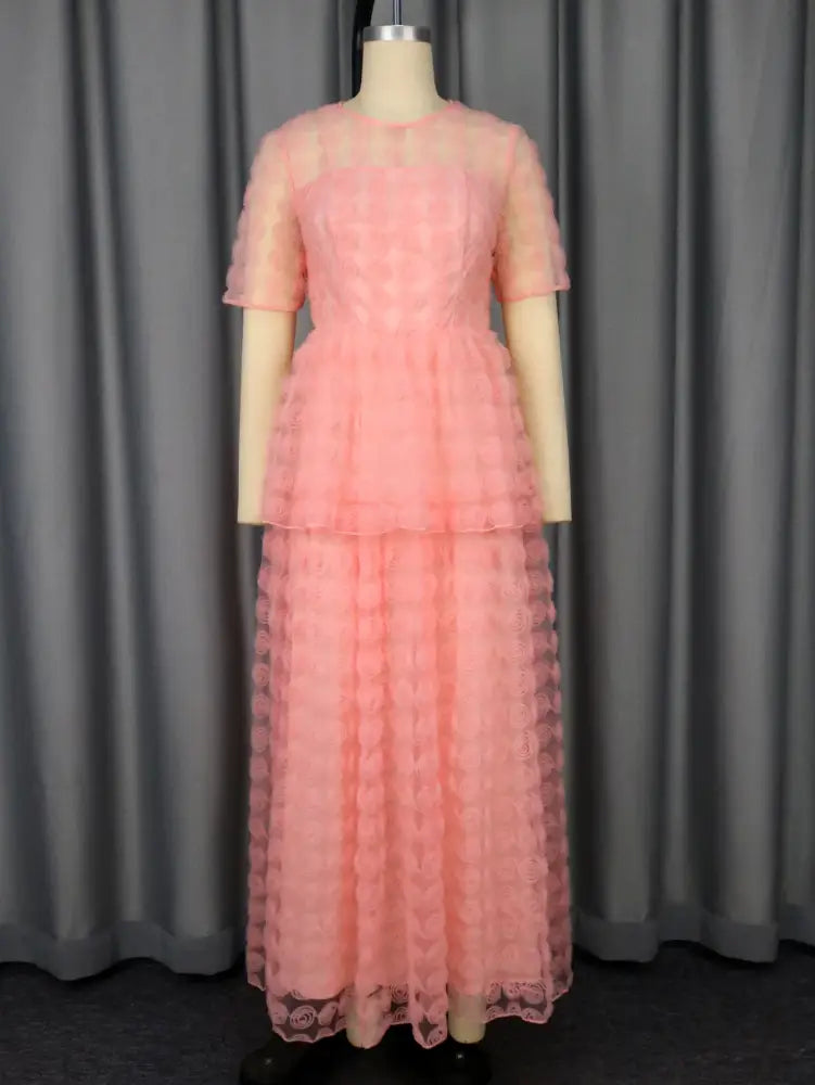 Women Pink Lace Maxi Dress Short Sleeve O-Neck Elegant Floral Pattern