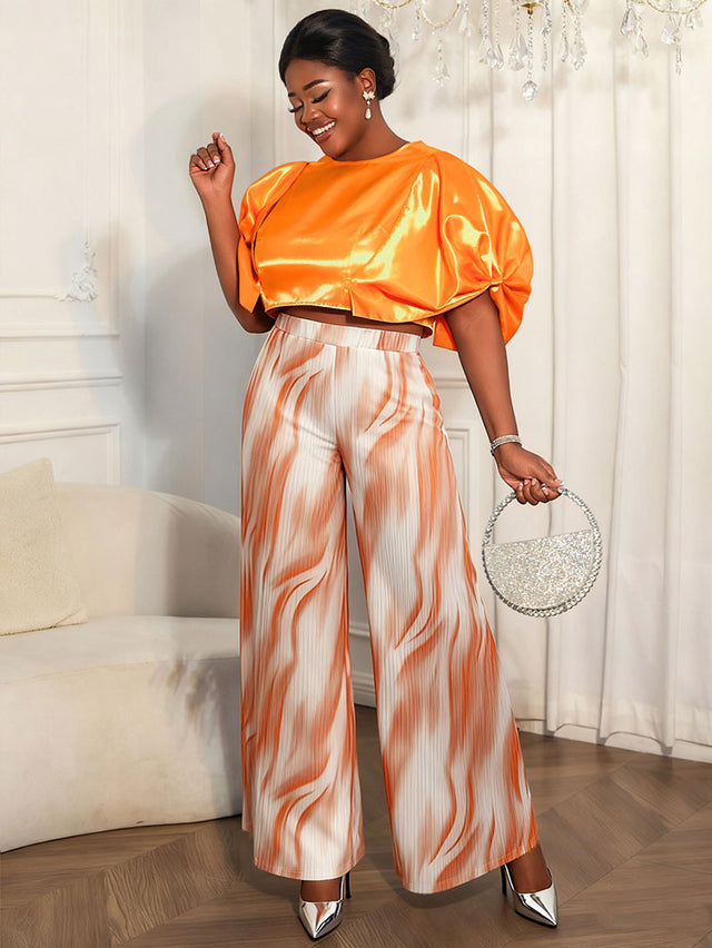 AOMEIDRESS Elegant Set Satin Puff Sleeve Top Wide Leg Pants for Party - Orange / L is backordered and will ship as soon as it is back in stock.