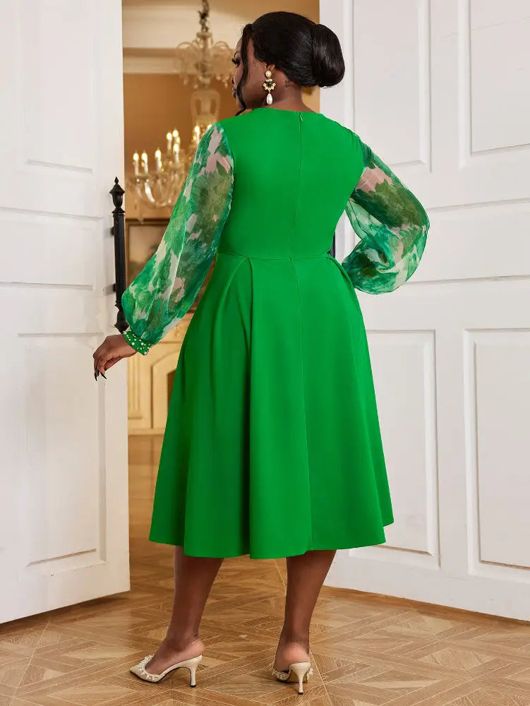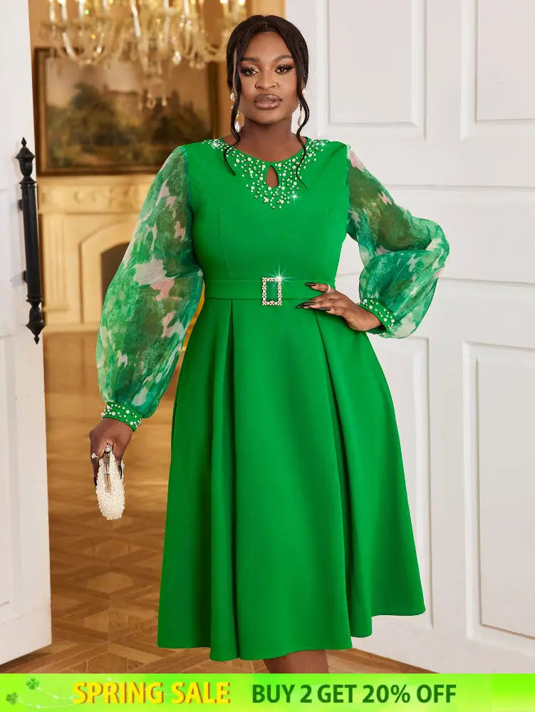 AOMEIDRESS Nail Bead A-line Dress O Neck Mesh Patchwork Bubble Sleeve - Green / S is backordered and will ship as soon as it is back in stock.