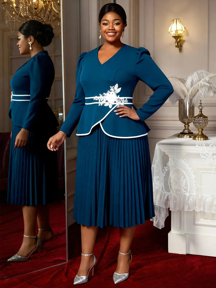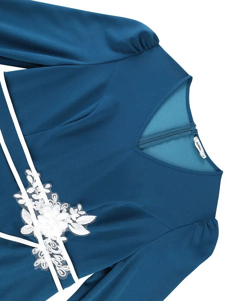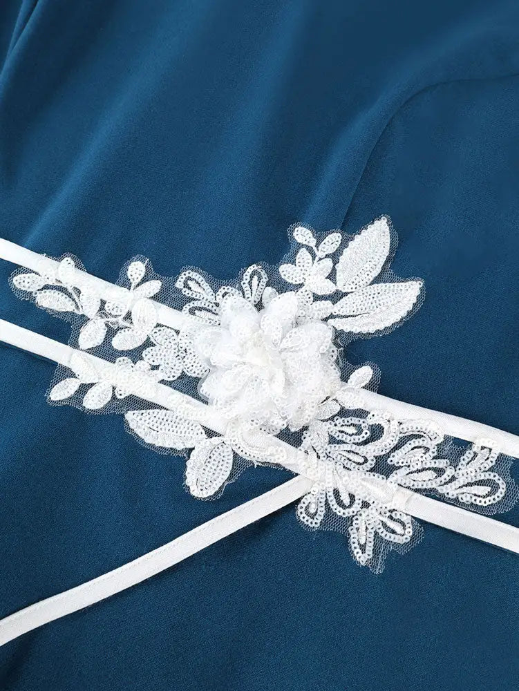 AOMEIDRESS Stylish Colorblock Pleated Dress V Neck with 3D Flower PeacockBlue / L
