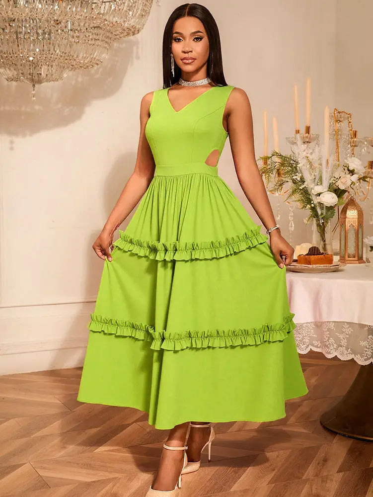 AOMEIDRESS A Line Maxi Party Dress Sleeveless Cut Out Ruffle Design MustardGreen / S