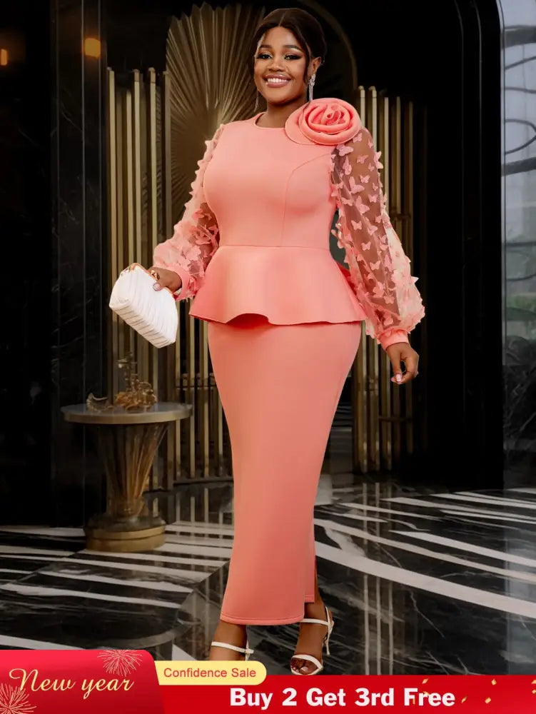 AOMEIDRESS Pink Sweet Dress Mesh Patchwork Butterfly Lantern Sleeve Plus Size Wedding Guest Dresses