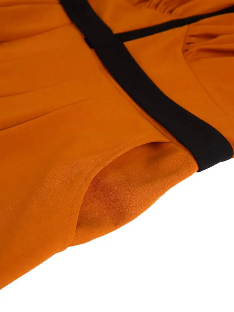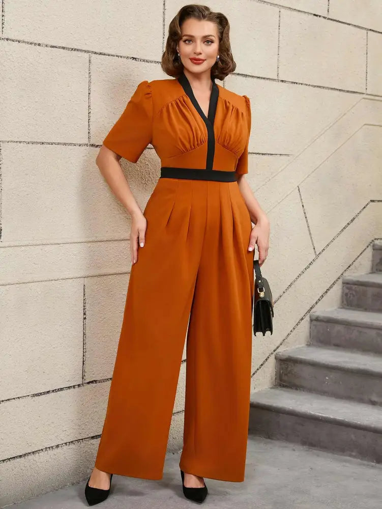 AOMEIDRESS Colorblock V Neck Short Sleeve Wide Leg Jumpsuit Brown