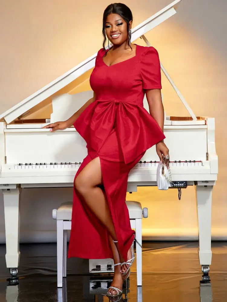AOMEIDRESS Red Shiny Short Sleeve Bow High Split Package Hip Dress
