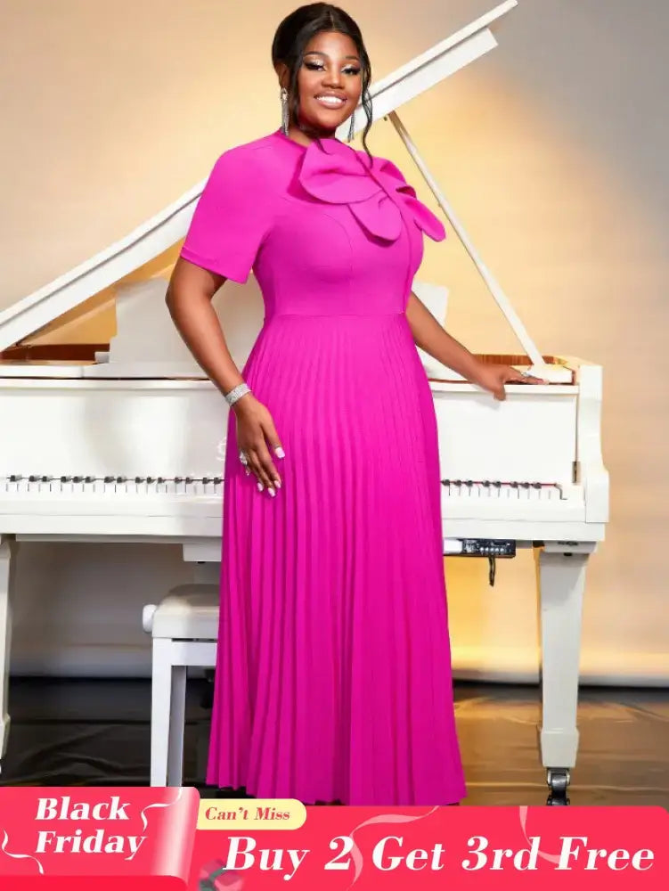 AOMEIDRESS Rose Casual Dresses O Neck Ankle Length Short Sleeves Pleated Big Bow - Rose / 1XL is backordered and will ship as soon as it is back in stock.
