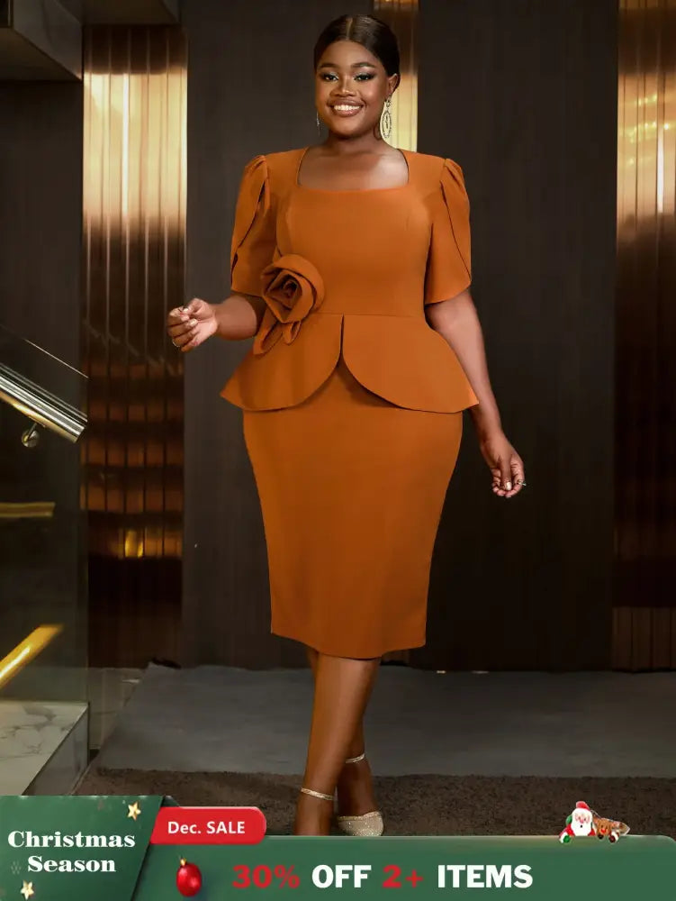 AOMEIDRESS 3D Floral Solid Color Dress Square Neck Long Sleeved Brown / S