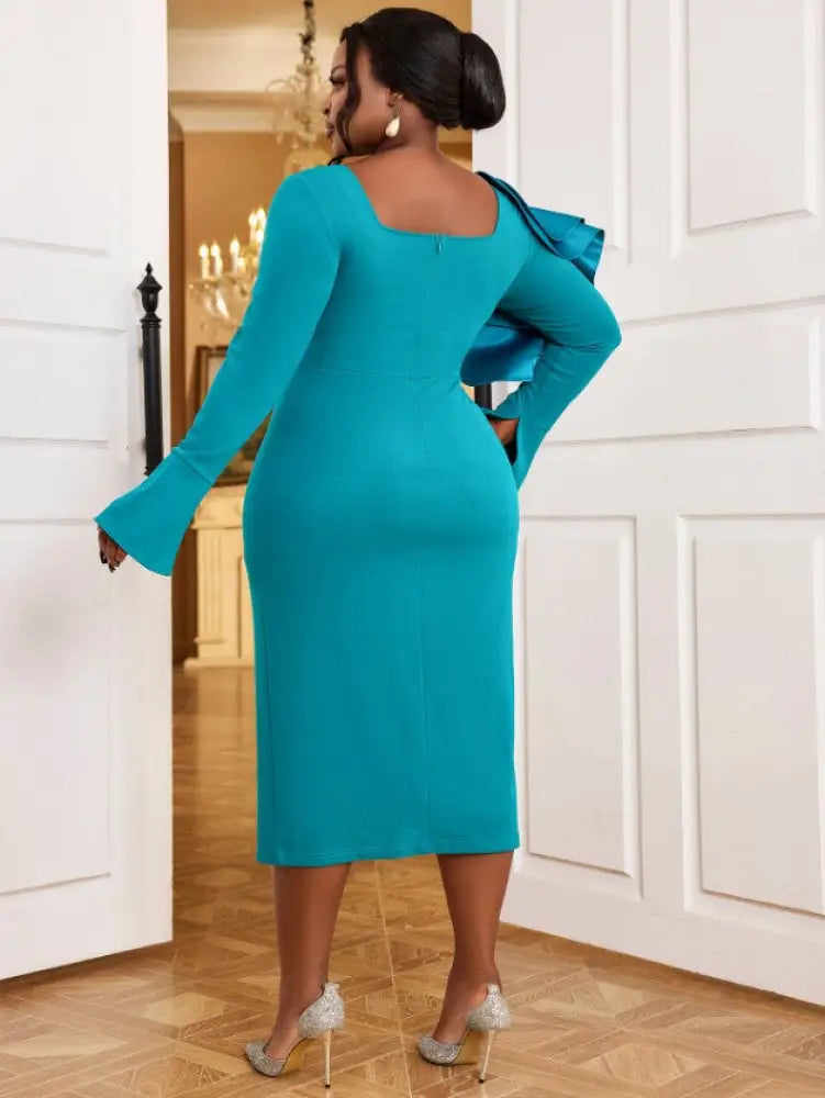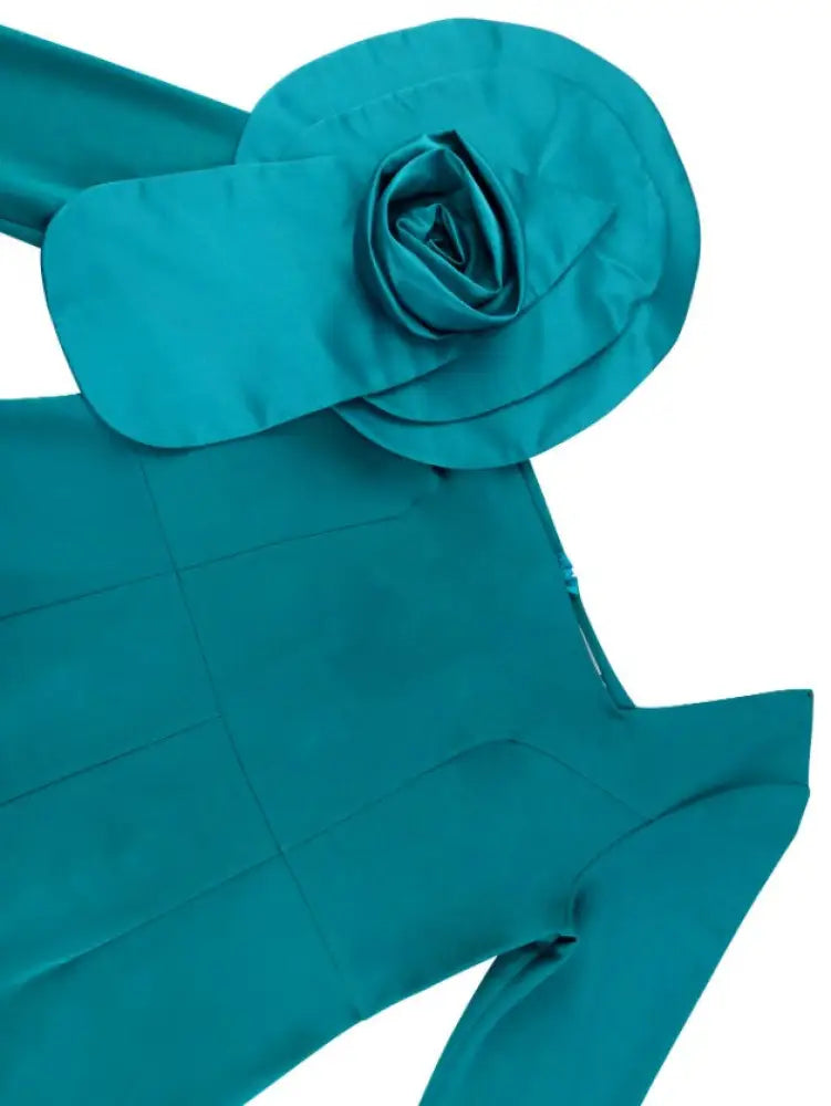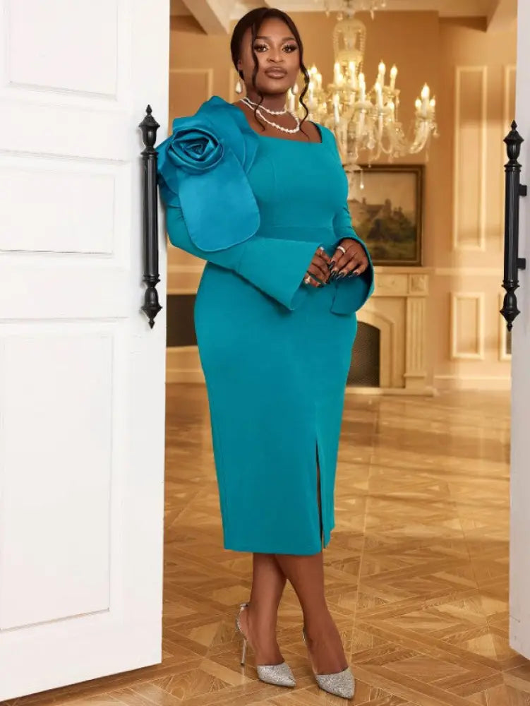 AOMEIDRESS Green Square Collar Midi Dress Long Flare Sleeve 3D Flower