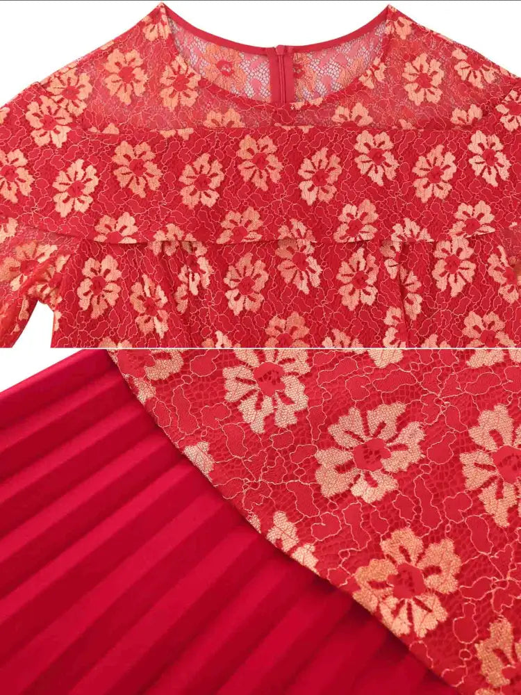 AOMEIDRESS Lace Floral Pleated Maxi Dress O Neck Patchwork High Waist Red / S