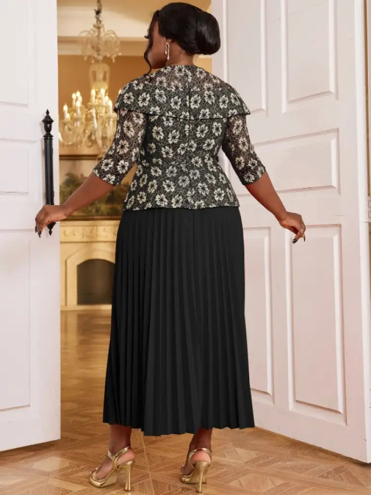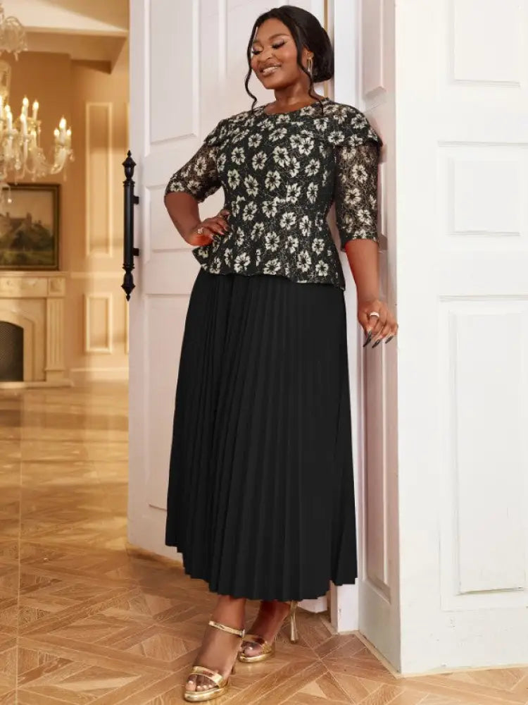 AOMEIDRESS Lace Floral Pleated Maxi Dress O Neck Patchwork High Waist