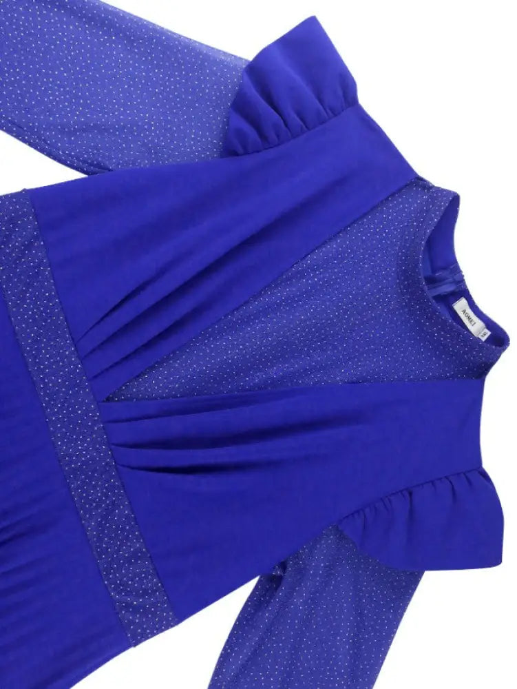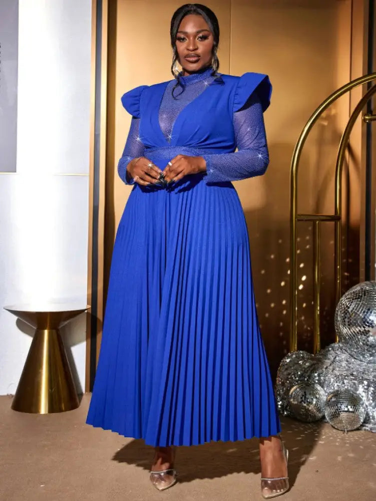 AOMEIDRESS Pleated Dress Mock Neck Sheer Long Sleeve Draped A Line Blue / S