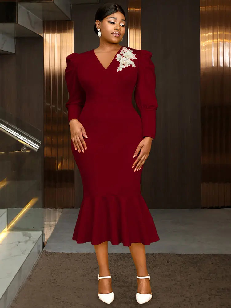 AOMEIDRESS Mermaid V Neck Party Dress 3D Embroidery Flower Puff Sleeve