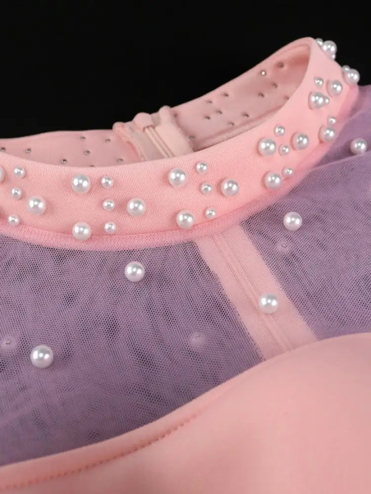 AOMEIDRESS Pink A Line Dress Mock Neck Tulle Beaded Feather Patchwork