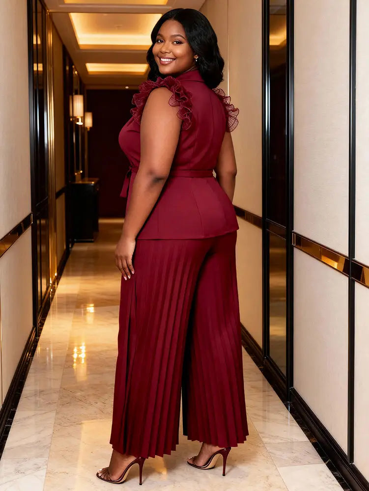 AOMEIDRESS Women Two Piece Set Ruffled Belted Blouse Wide Leg Pants - Wine / L is backordered and will ship as soon as it is back in stock.