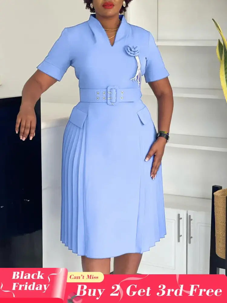 AOMEIDRESS Elegant Dresses V Neck Short Sleeves Pleated Belt 3D Flowers