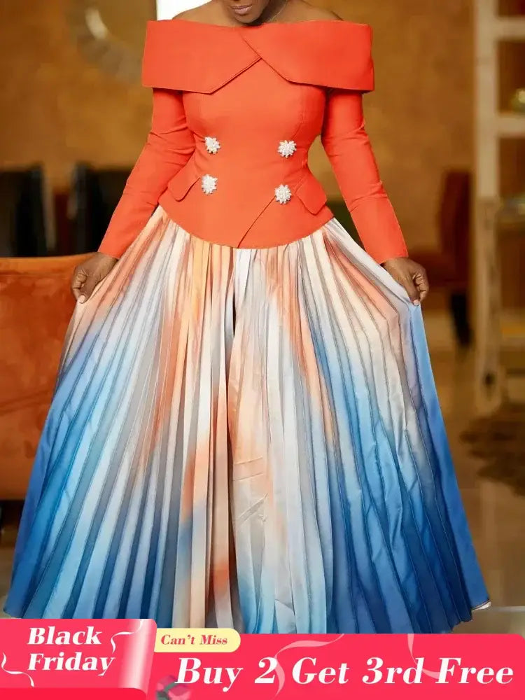 Women's Two Piece Set Elegant Off Shoulder Suit Tops Printed Loose Long Pleated Skirt - Orange / S is backordered and will ship as soon as it is back in stock.