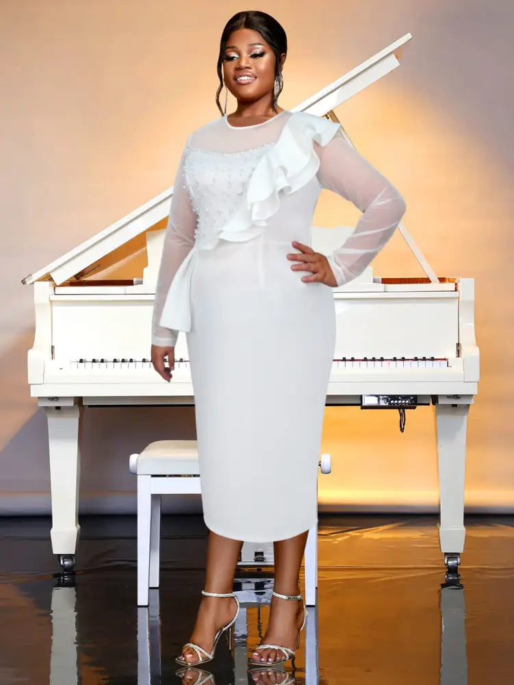 AOMEIDRESS Crew Neck Dress Sheer Long Sleeve Peplum Waist Midi