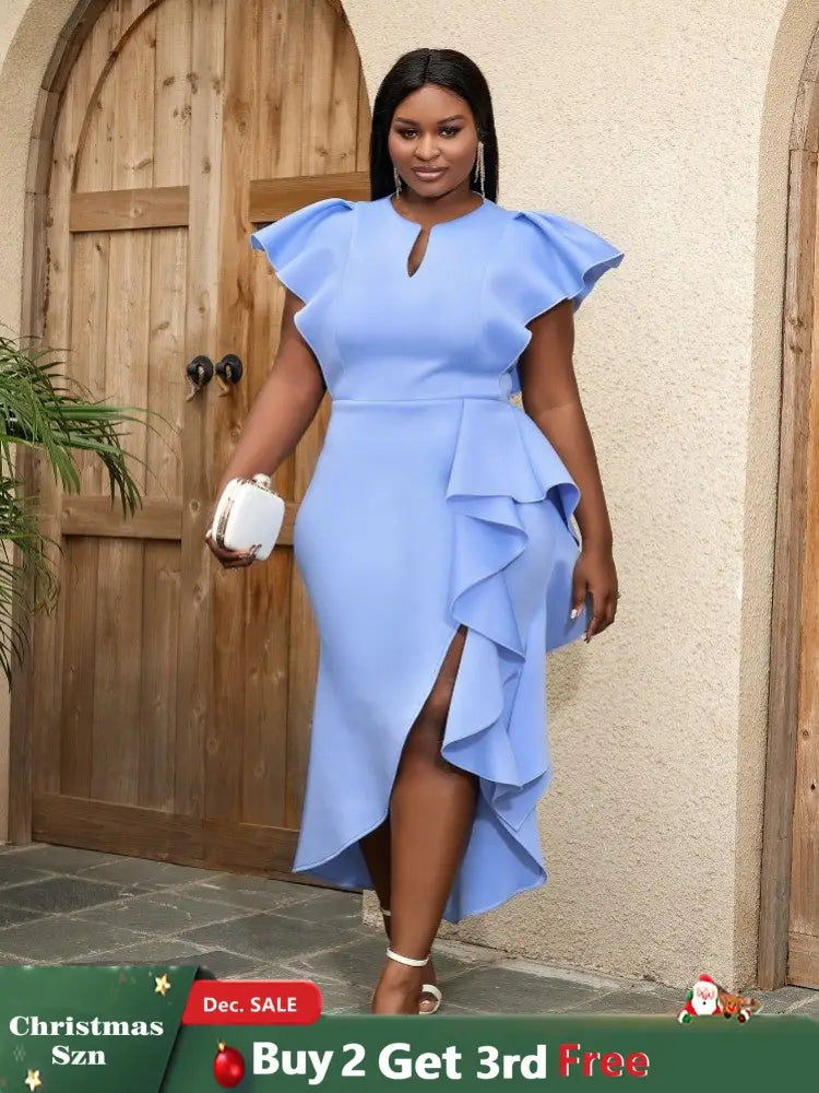 AOMEIDRESS Women Elegant Ruffles Slit Midi Dresses Bodycon Party