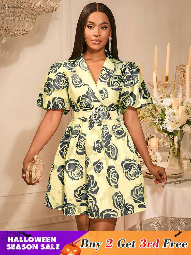 AOMEIDRESS Jacquard A Line Mini Dresses Puff Sleeves Turn Down Collar