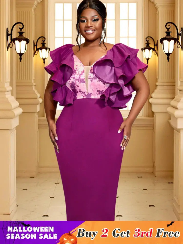 AOMEIDRESS Purple Dress V Neck Printed Mesh Patchwork Ruffles Sleeve
