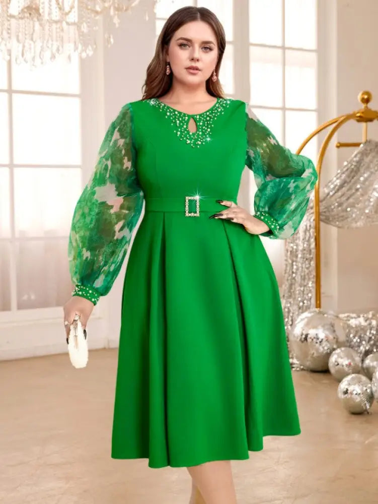 AOMEIDRESS A Line Dress O Neck Beading Mesh Patchwork Lantern Sleeves - Green / S is backordered and will ship as soon as it is back in stock.