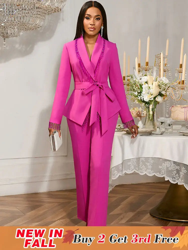 AOMEIDRESS Elegant Wedding Party Pantsuit with Tassel Waist Belt Rose / S