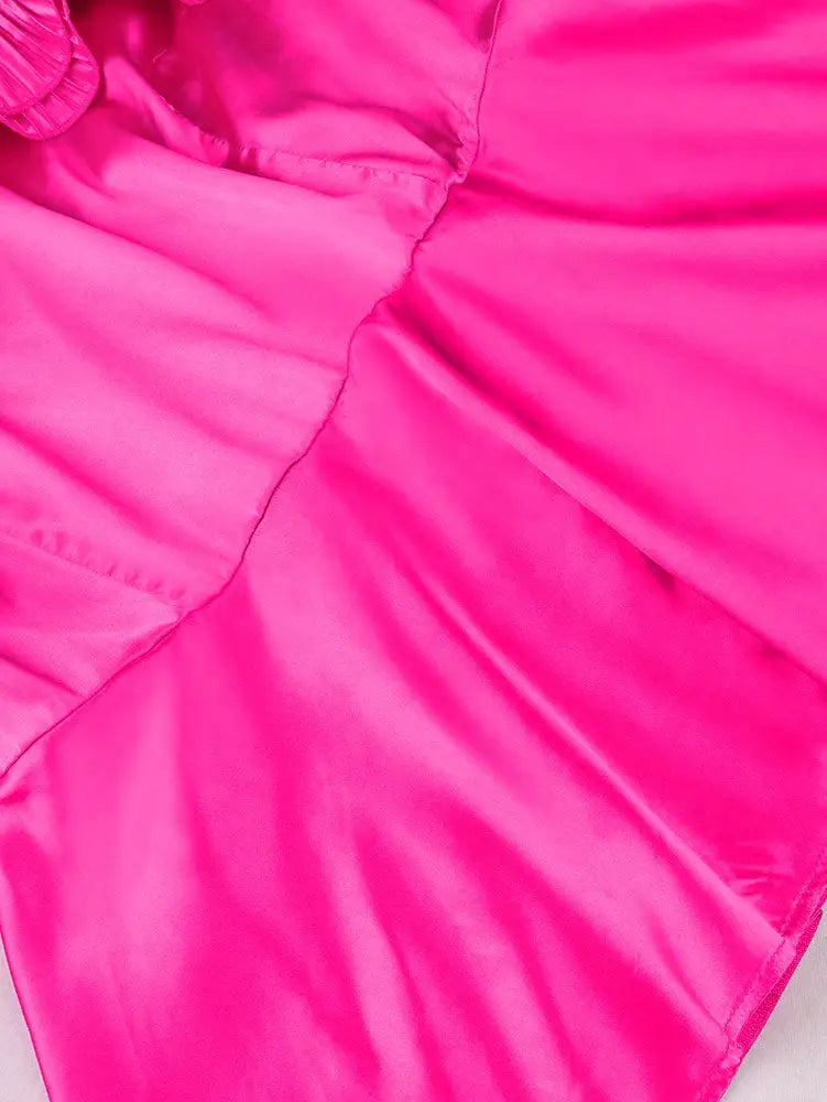AOMEIDRESS Shiny One Shoulder Ruffled Satin Top Long Puff Sleeves Rose / L