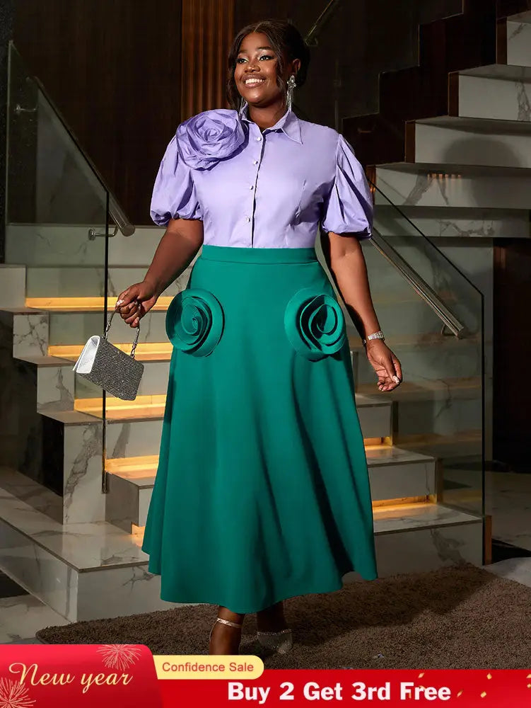 AOMEIDRESS Office Two Piece Set 3D Flower Shirt With A Line Skirt Purple / S