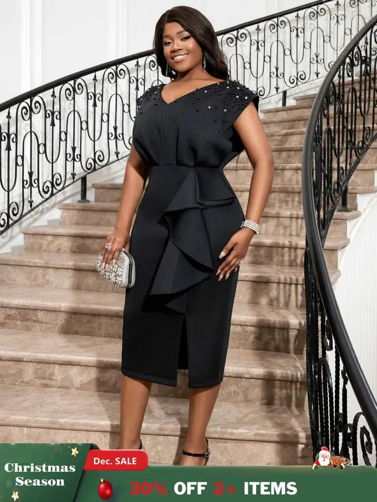 AOMEI Black V Neck Dress Women Sleeveless Beading Diamonds High Waist Ruffles - Black / 1XL is backordered and will ship as soon as it is back in stock.