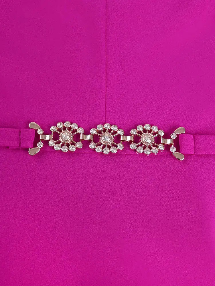 AOMEIDRESS A Line Pleated Dress V Neck Short Sleeve with Diamond Belt Rose / L