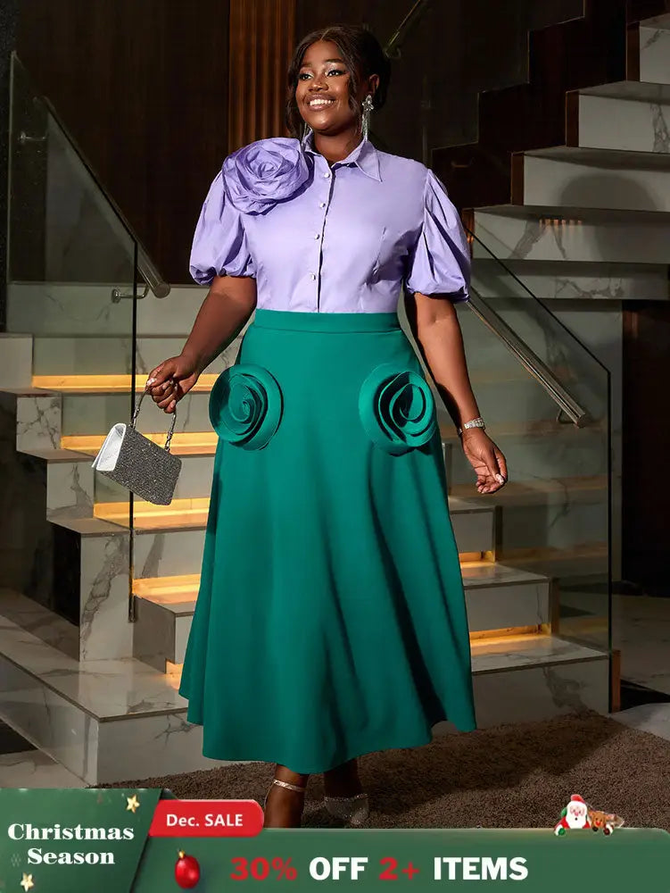 AOMEIDRESS Office Two Piece Set 3D Flower Shirt With A Line Skirt - Purple / S is backordered and will ship as soon as it is back in stock.