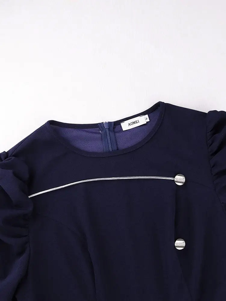 AOMEIDRESS Elegant A Line Dress O Neck Long Sleeve Ruffled Belt Gowns Navy / S