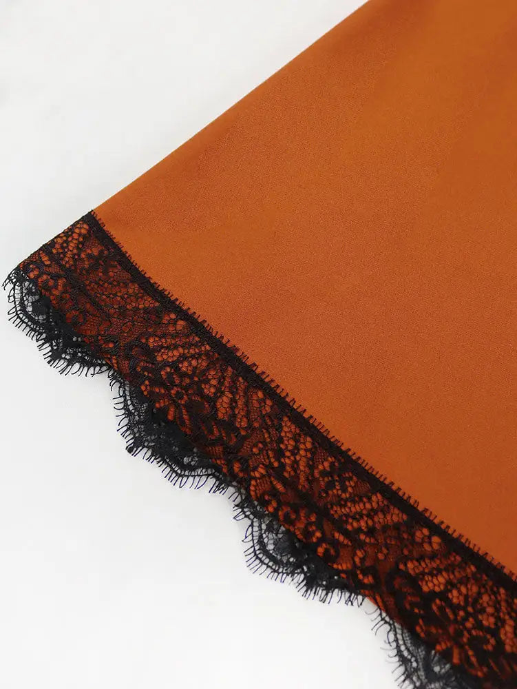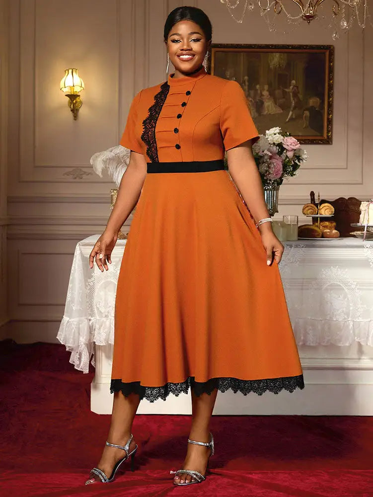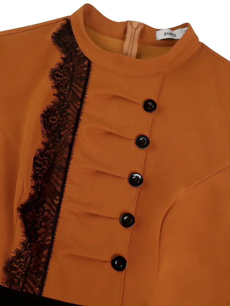 AOMEIDRESS Elegant Brown A Line Midi Church Dress With Lace Trim Button