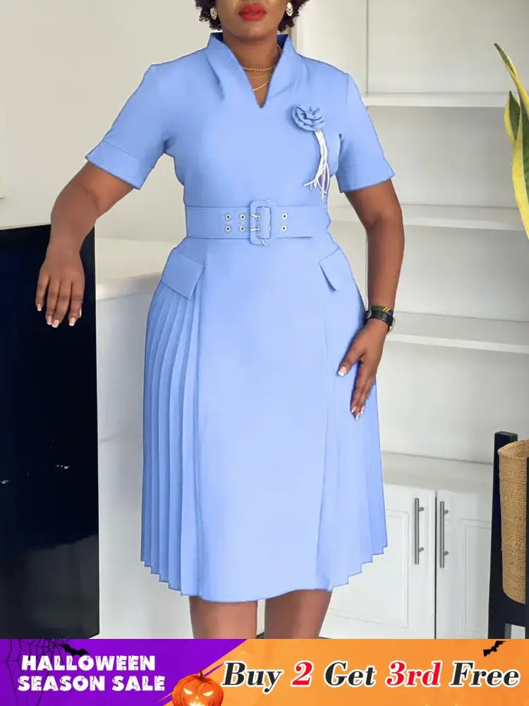 AOMEIDRESS Elegant Dresses V Neck Short Sleeves Pleated Belt 3D Flowers