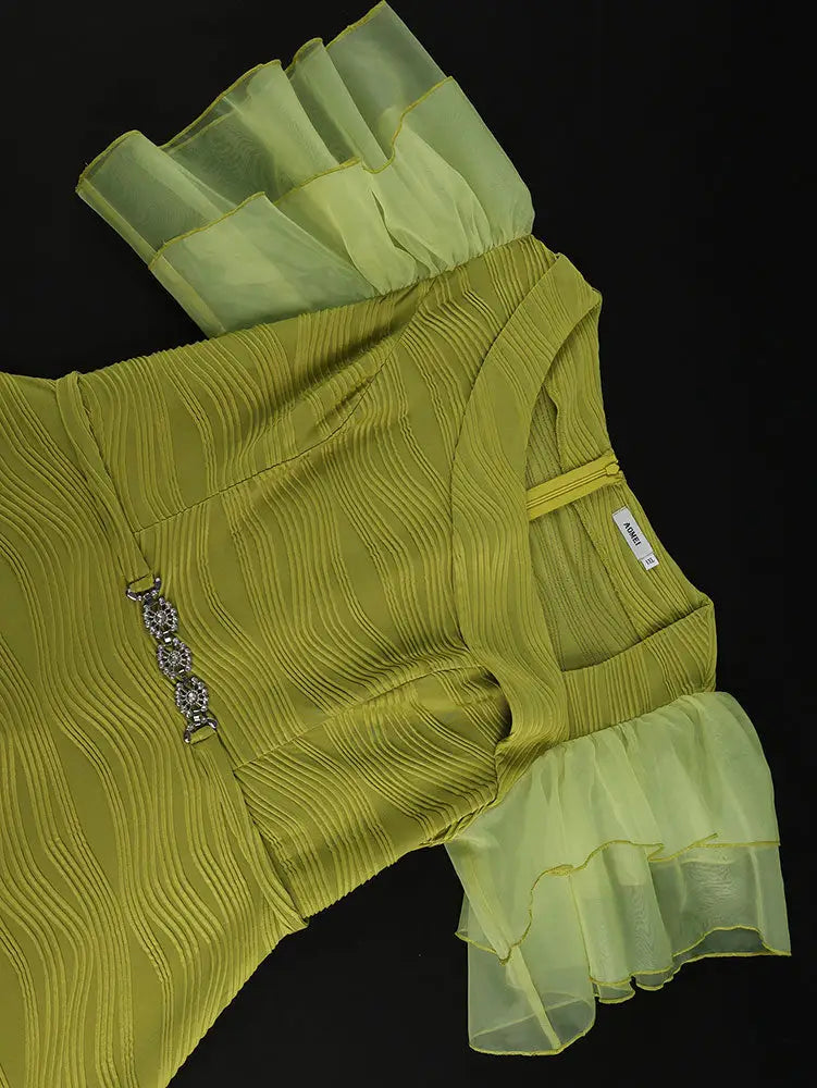 AOMEIDRESS Elegant Green Knit Dress Organza Ruffle Sleeve For Party MustardGreen / S