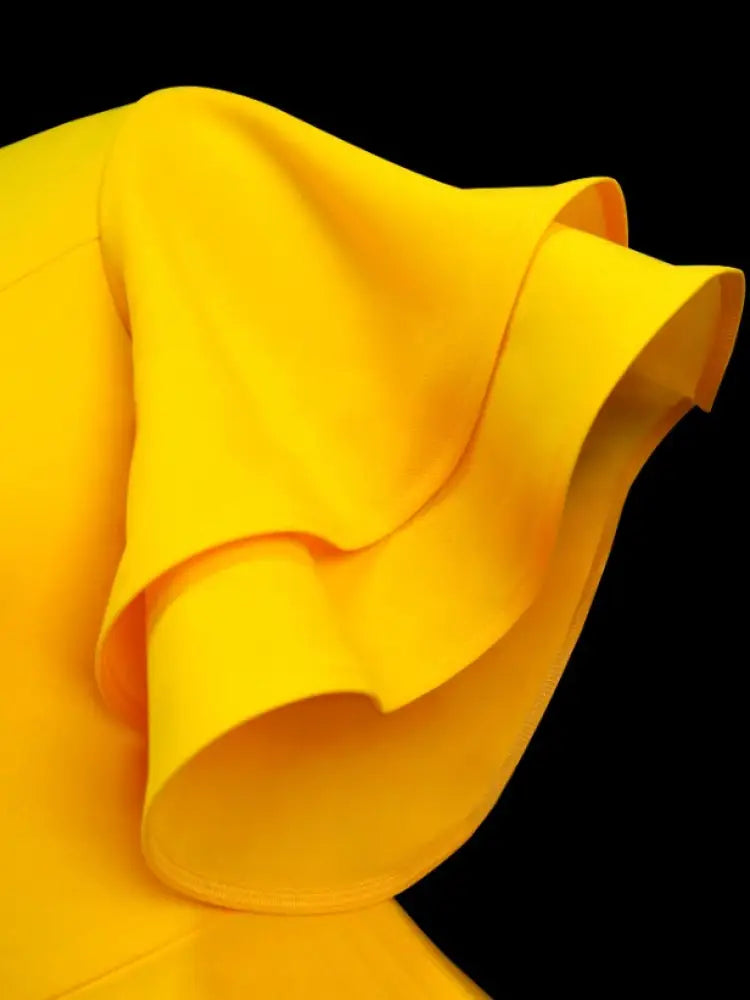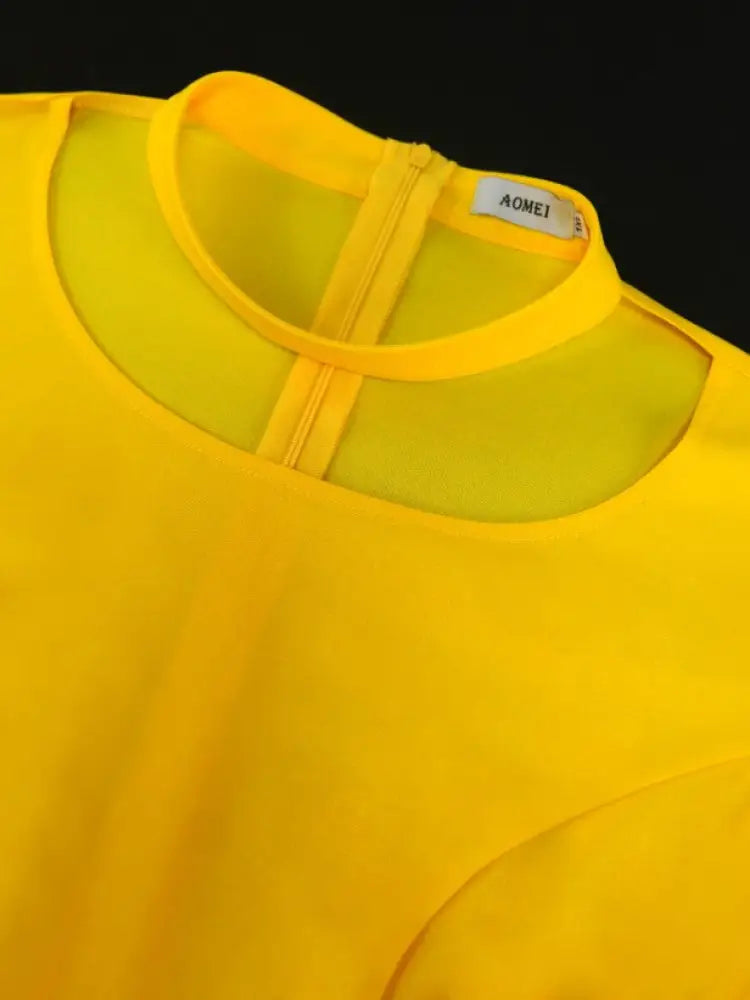 AOMEIDRESS Yellow Halter O Neck Short Ruffles Sleeves Pleated Dress