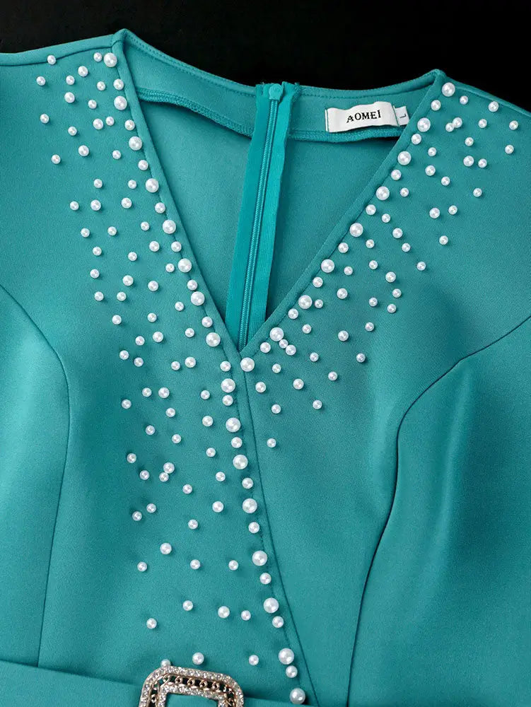 AOMEIDRESS Elegant Beading Evening Dress Sheer Sleeve Waist Belt Slit - Green / S is backordered and will ship as soon as it is back in stock.