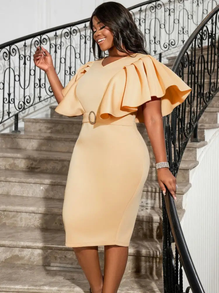 AOMEIDress Ruffle Sleeve Bodycon Event Dress - Khaki / 2XL is backordered and will ship as soon as it is back in stock.