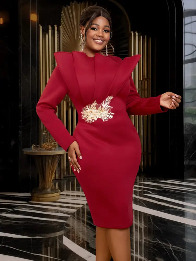 AOMEIDRESS Party Dress O Neck Long Sleeves Appliques High Waist Midi