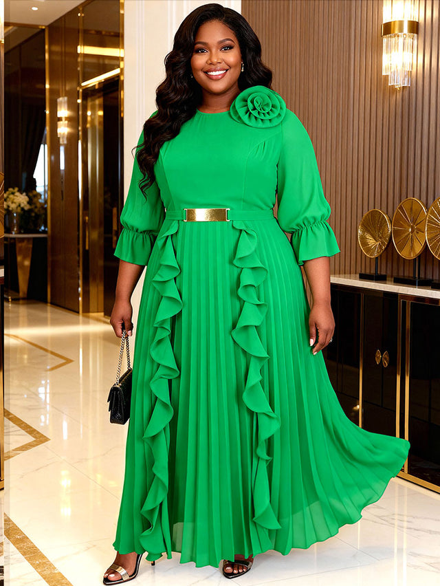 AOMEIDRESS Chiffon Pleated Dress with Layered Ruffles 3D Flower Belt