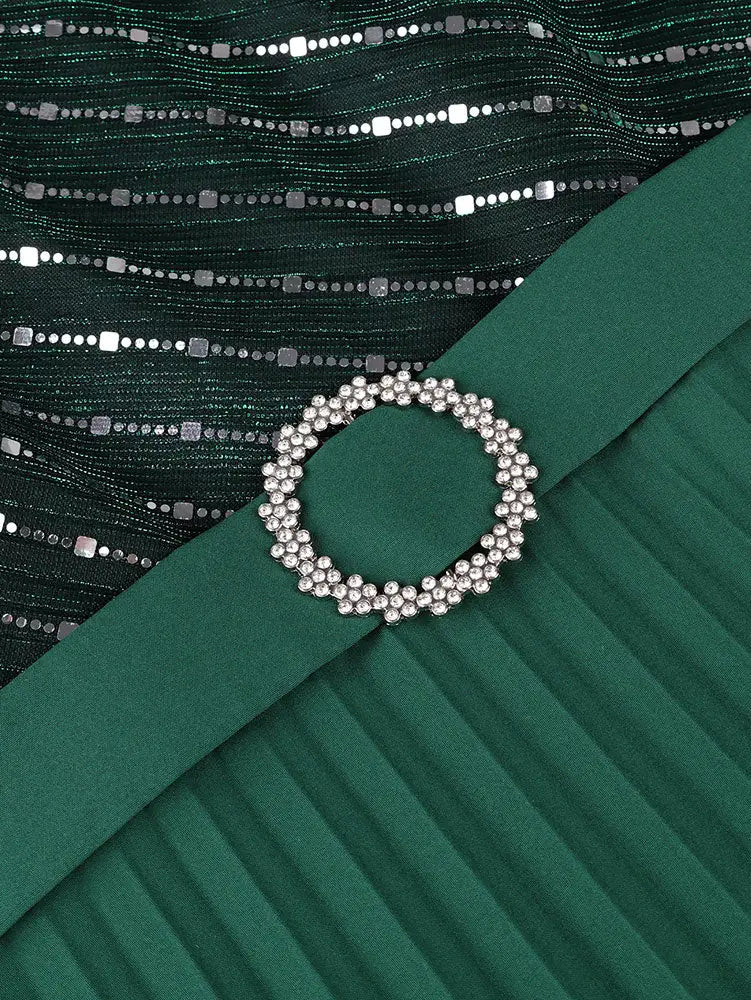 AOMEIDRESS Pleated Chiffon Dress with Shiny Mesh 3D Flower Belt Party - DarkGreen / L is backordered and will ship as soon as it is back in stock.