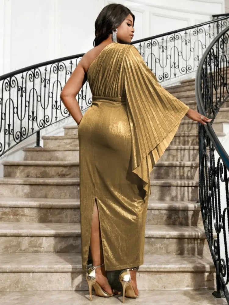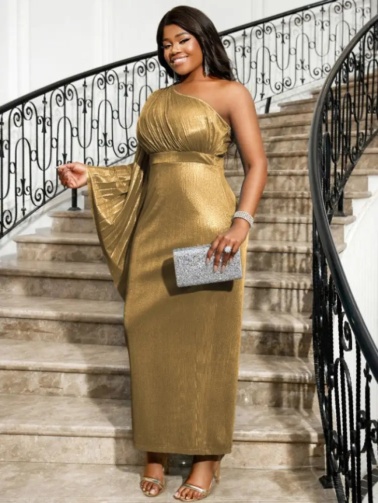 AOMEIDRESS One Shoulder Dress Pleated Long Flare Sleeve Package Hip - Gold / S is backordered and will ship as soon as it is back in stock.