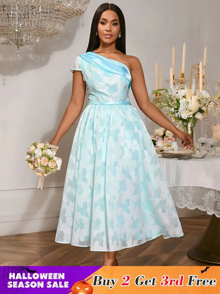 AOMEIDRESS Elegant Jacquard A Line Wedding Guests Dress One Shoulder - LightBlue / S is backordered and will ship as soon as it is back in stock.