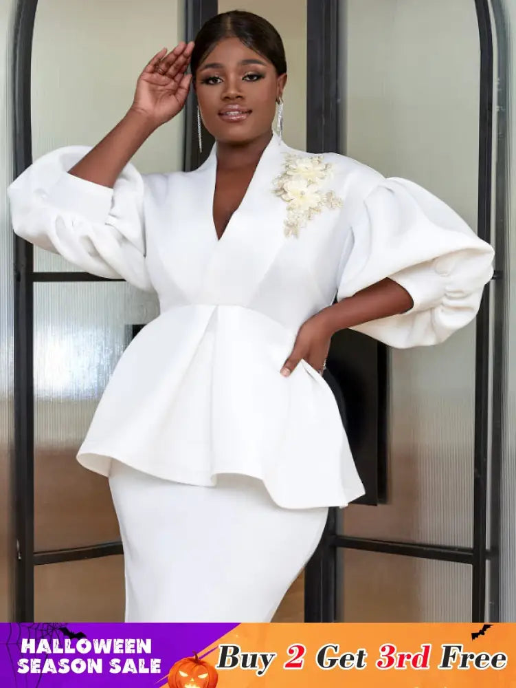AOMEI Plus Size V Neck Lace Flower Tops Half Lantern Sleeve