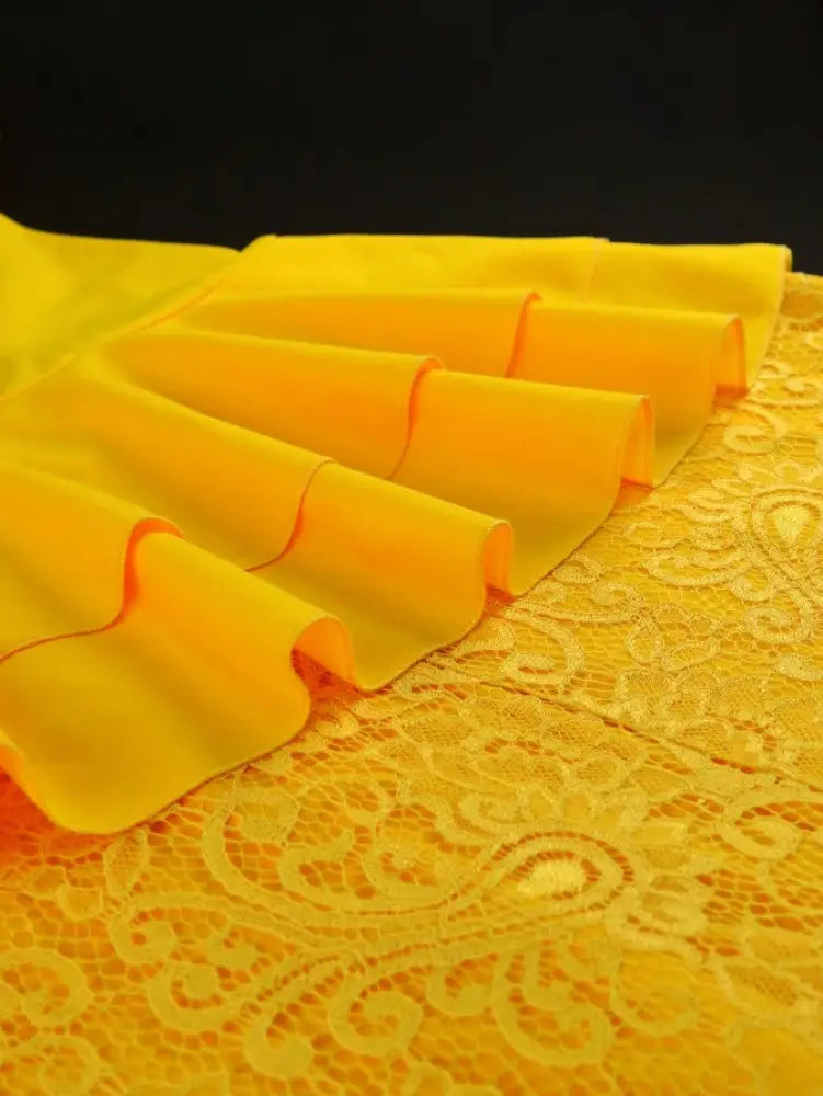 AOMEIDRESS Yellow A Line Maxi Dress O Neck Lace Patchwork Long Sleeve
