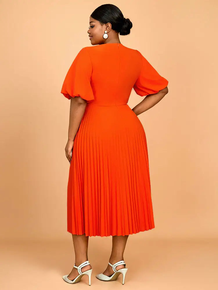 AOMEIDRESS Orange Mid Calf Dresses O Neck Half Puff Sleeves Wedding Guest Dress - Orange / 0XL is backordered and will ship as soon as it is back in stock.