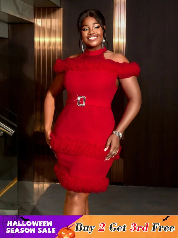 AOMEIDRESS Red Mini Dress Halter Cold Shoulder Patchwork Mesh Ruffles