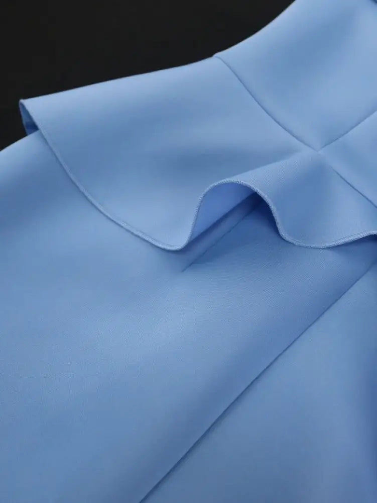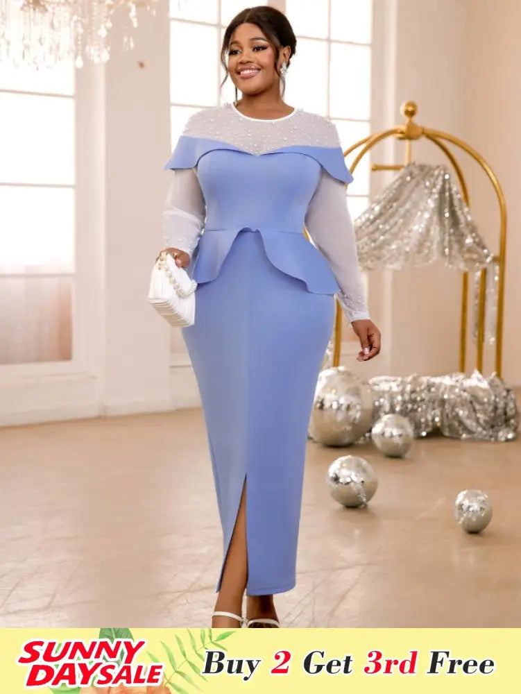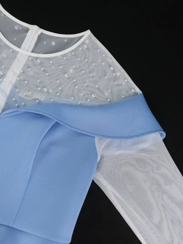 AOMEIDRESS Peplum Dresses O Neck Long Sheer Beaded Sleeve High Waist Blue / S